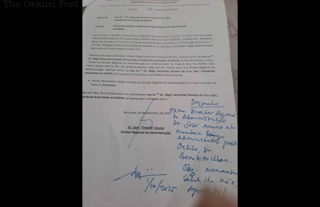 Entretantu, karta despaixu ofisiál ne’ebé The Oe-Kusi Post (TOP) asesu, husi Diresaun Rejionál Administrasaun, ho númeru 27RAEOA/DRA/X/2025, ne’ebé asina husi Diresaun Rejionál Administrasaun, José Tanesib Anunu ho Diretór Jerál Komisaun Funsaun Públika RAEOA, Domingos Punef.